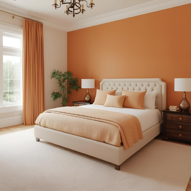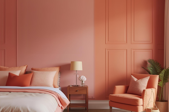 Zoals we zagen bij de Barbiecore-make-over, is het belangrijk om voldoende zachte tinten te gebruiken om rust te creëren. Daarom zouden wij kiezen voor een accentmuur in Sigma Orange Poppy of Sigma Blaze of Glory.